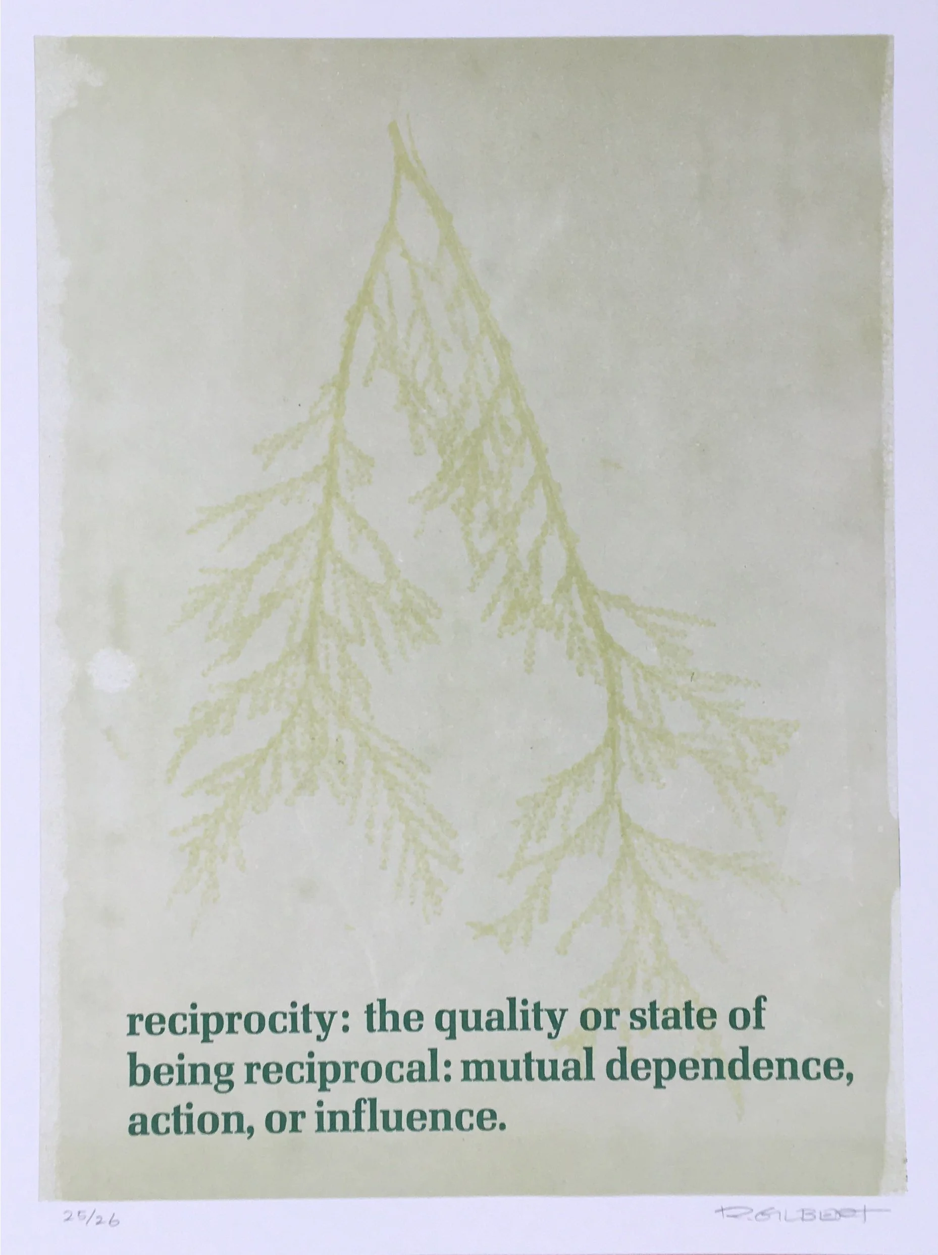 Editioned for the College Book Arts Association regional exchange in winter 2020-2021. The theme was environment/landscape/land acknowledgement, taking focus on the region we currently inhabit. I was influenced by the powerful concept of reciprocity as it relates to all life, with the Western redcedar (or “Tree of Life”) at the center.